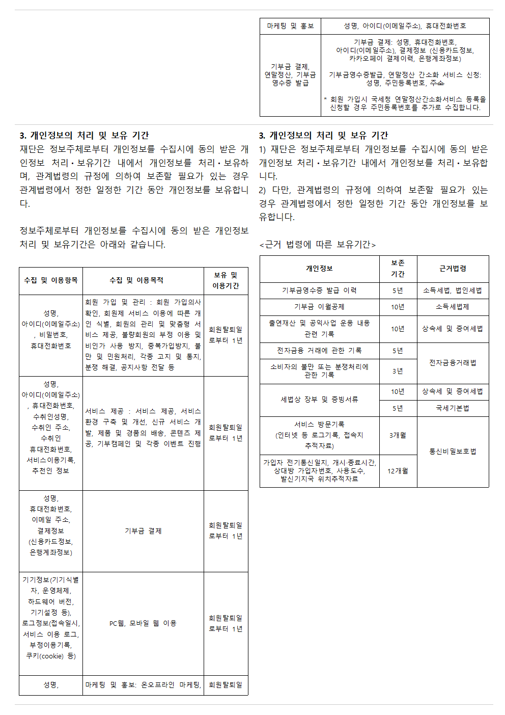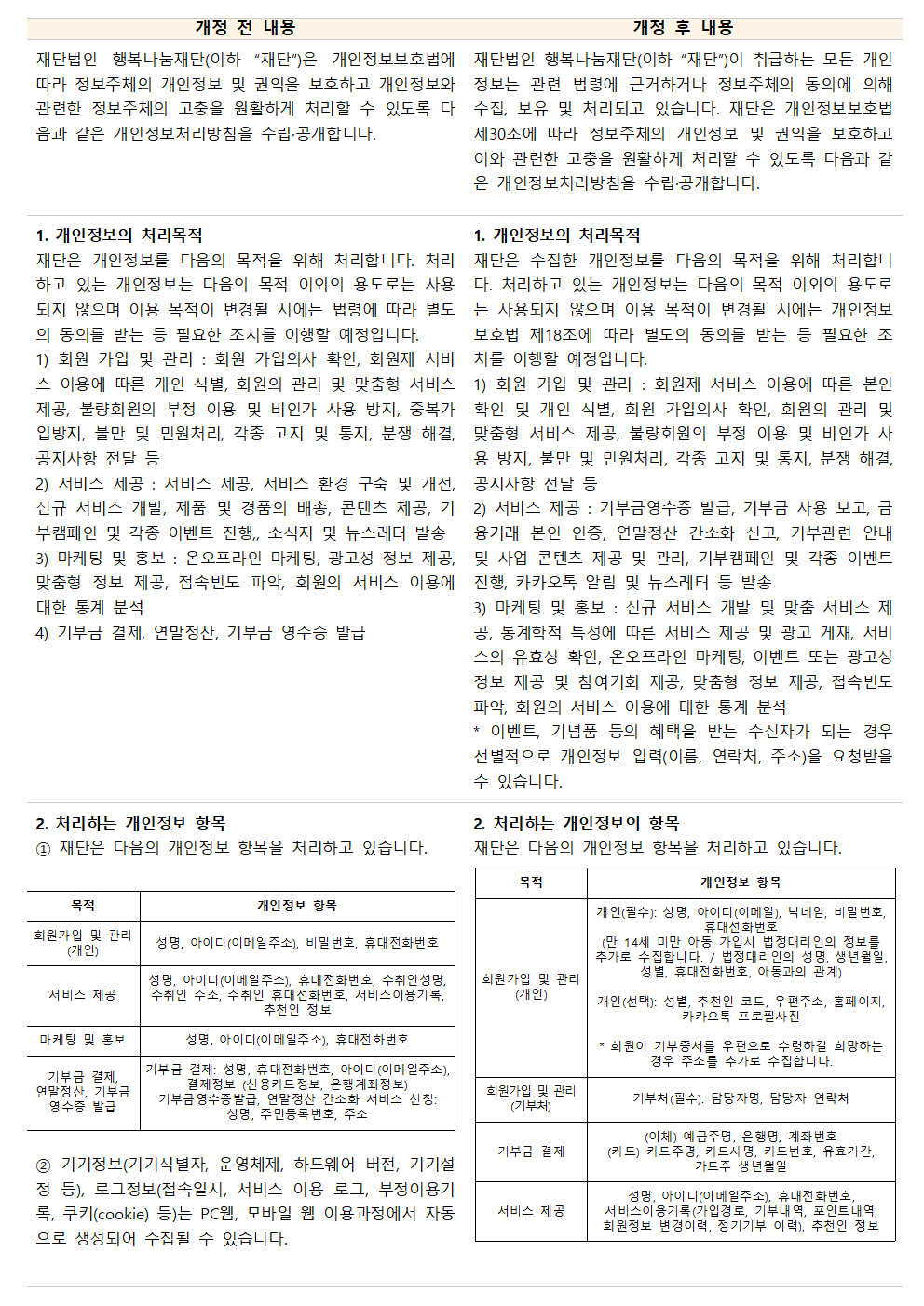 기부자님들께 더 편리한 서비스를 제공하고, 다양한 기부처를 제공하기 위해 개인정보처리방침이 아래와 같이 개정될 예정이오니 서비스 이용에 참고하시기 바랍니다.